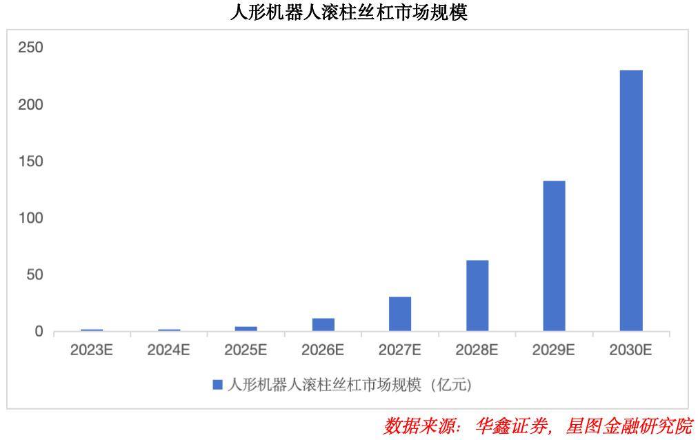 目前,行星滚柱丝杠单价高达2万元,是线性关节中价值占比最高的元件。从特斯拉人形机器人的拆解情况来看,其单台产品需搭载14个行星滚柱丝杠。未来,随着技术成熟与规模化生产,行星滚柱丝杠的成本有望逐步下探,或推动其大规模应用。根据华鑫证券预测,2030年行星滚柱丝杠市场规模有望达到229.6亿元。