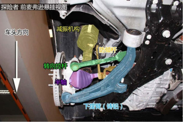 根据福特探险者承载式车身的结构特点,车辆的悬架可单独分为前后两个部分。前部悬架如上图所示,由减震器、防倾杆、转向拉杆、半轴、下摆臂等元件组成。