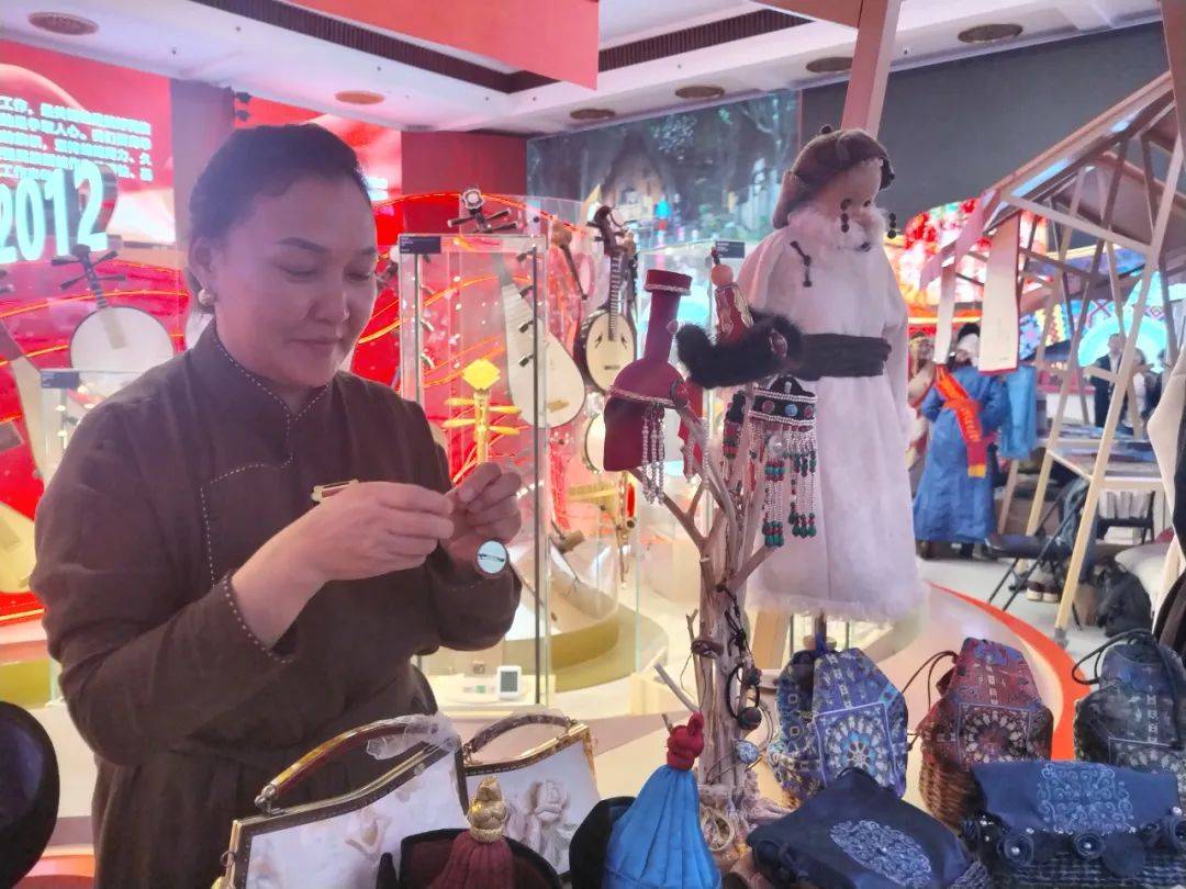 而内蒙古白茬皮袍制作技艺第四代传承人额尔登其其格,则把她制作的蒙古族皮袍及十多种创新皮制工艺品带到北京。