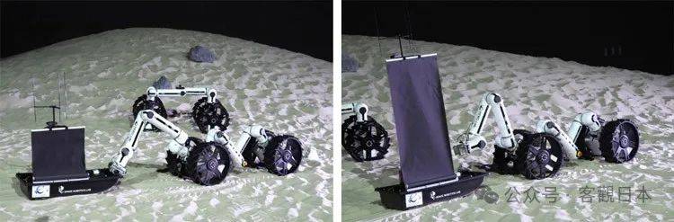 组装完成的机器人将承担建材运输、土木工程、结构展开、组装等作业。实验中引人注目的环节之一是太阳能电池板的铺设。Moonbot将装载电池板的基座拖曳至目标地点后,卷曲的电池板随即展开。未来计划不在电池板上安装展开用电机,而是通过机器人搭载的电机的动力将电池板展开。